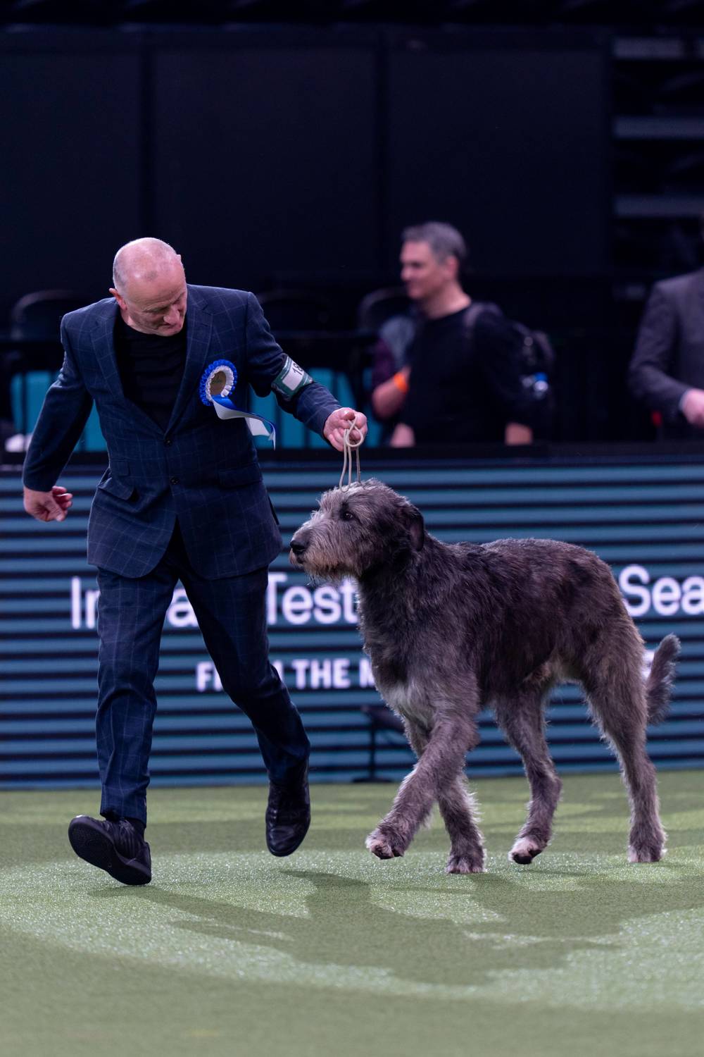 Tozie, an Irish Wolfhound, owned by Debbie Tebbutt, and handled by husband Roger Tebbutt, won the grand final of The Kennel Club Vulnerable British and Irish Native Breeds competition at Crufts, on Friday 7 March.