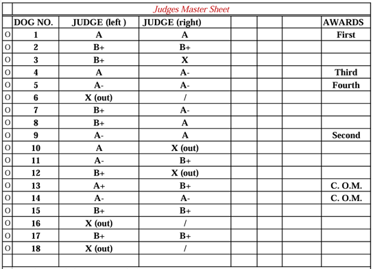 - The next two or three pages should be set up as follows and on which the judge’s marks will be entered after each brace to form a matrix of marks