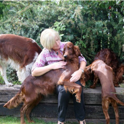 Over the years, she has owned various breeds, including Irish Setters, Irish Red and White Setters, English Setters, Afghan Hounds, and Rough Collies. Currently, she owns two top Irish Red & White Setter Show Champions, an Afghan Hound, an English Setter, and six Irish Setters.