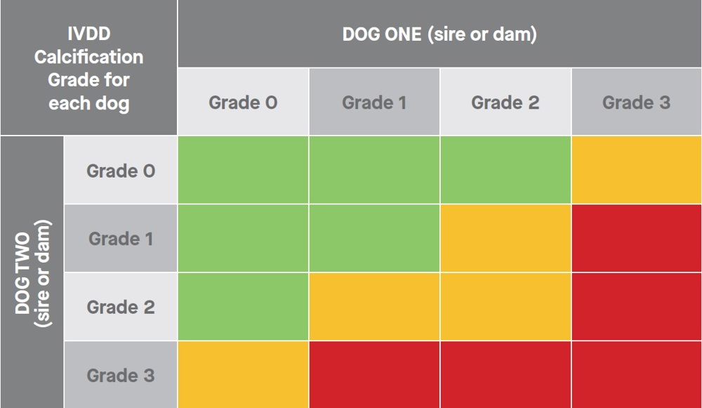 Red: A mating that has a high risk of producing puppies that may grow up to be affected by IVDD. These matings are not recommended. IVDD can have a serious impact on a dog’s health and welfare, so a mating which has a high risk of producing affected puppies should never knowingly be carried out.