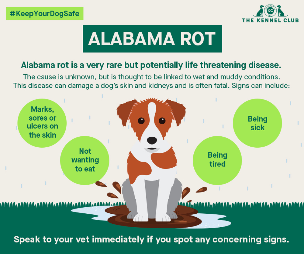 We don't yet know what causes Alabama rot, so diagnosing and treating an affected dog can be very difficult. Researchers believe that wet muddy conditions may somehow be linked to what causes this condition. Many of the dogs that died from Alabama rot had been walking in muddy woodland areas during winter and spring months just before becoming ill.
