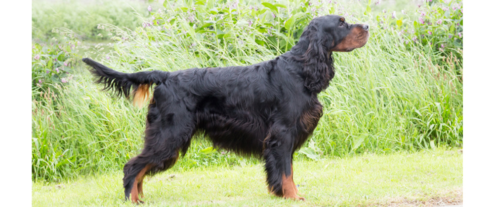 The heavy weight of the Setter breeds, the Gordon takes its name from the Duke of Gordon who began developing Setters seriously between 1800 and 1820 at Gordon Castle in Scotland. Although the present day Gordon Setters are black and tan, in the mid-19th century many of the dogs in the Duke of Gordon's large kennel were black and white or black/white and tan, as it was felt that these colours were easier to pick out when working. Selective breeding has now established the Gordon as the black and tan setter.