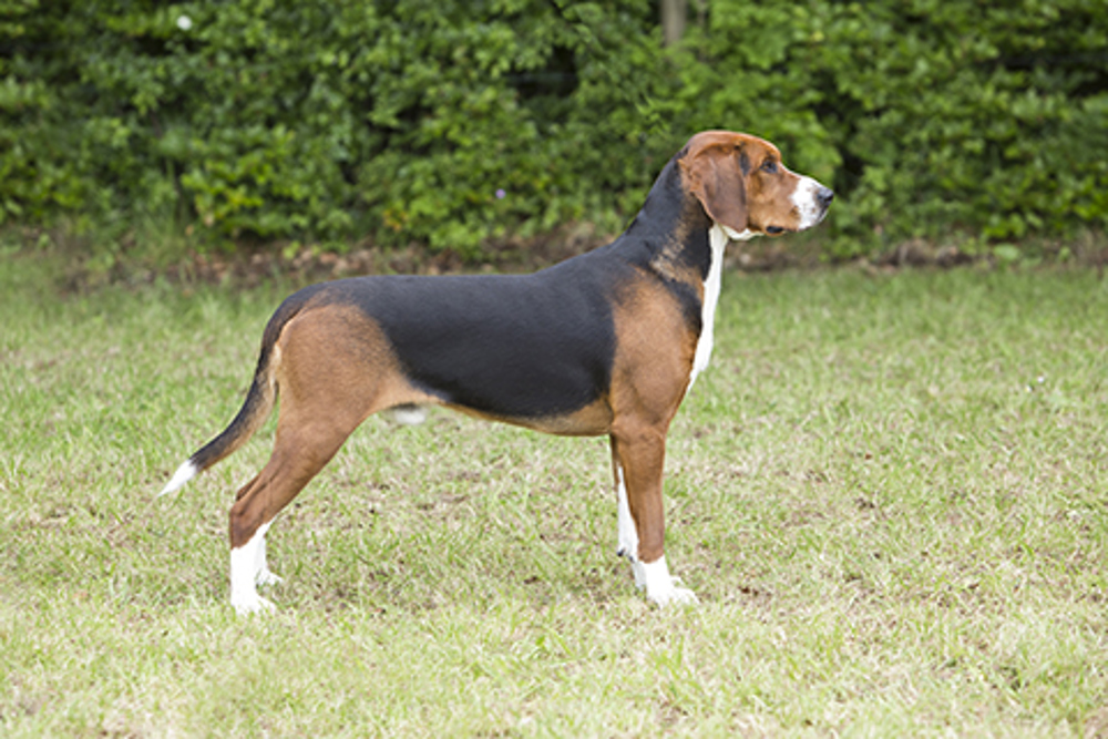 The richly coloured black, white and tan scent hound from Sweden is the result of crossing the English Foxhound with German Hounds. The breed was developed by Count Hamilton, a hound enthusiast and a founder of the Swedish Kennel Club. The Hamiltonstovare hunts singly and not in packs and was developed to hunt fox, deer, hare and wild boar. The breed first appeared in the Swedish show rings in 1886.