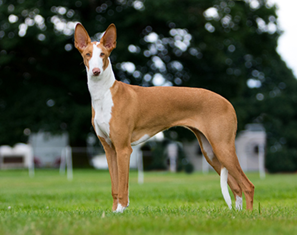 The elegant outline of the Ibizan with its large ears can be seen in the drawings on Ancient Egyptian tombs. He is the rabbit hunter of Ibiza (Podenco Ibicenco) and has been seen in Ibiza and the neighbouring Island of Formentera for thousands of years. The small island population meant a relatively small gene pool which was kept pure and this resulted in consistency in type. There are two types of coat, the smooth and rough. The breed is noted for its relatively straight forehand angulation and light hovering gait.