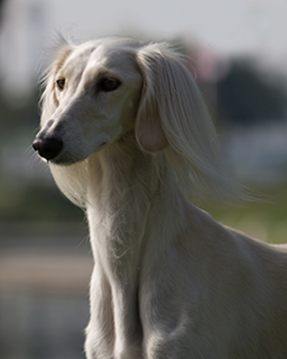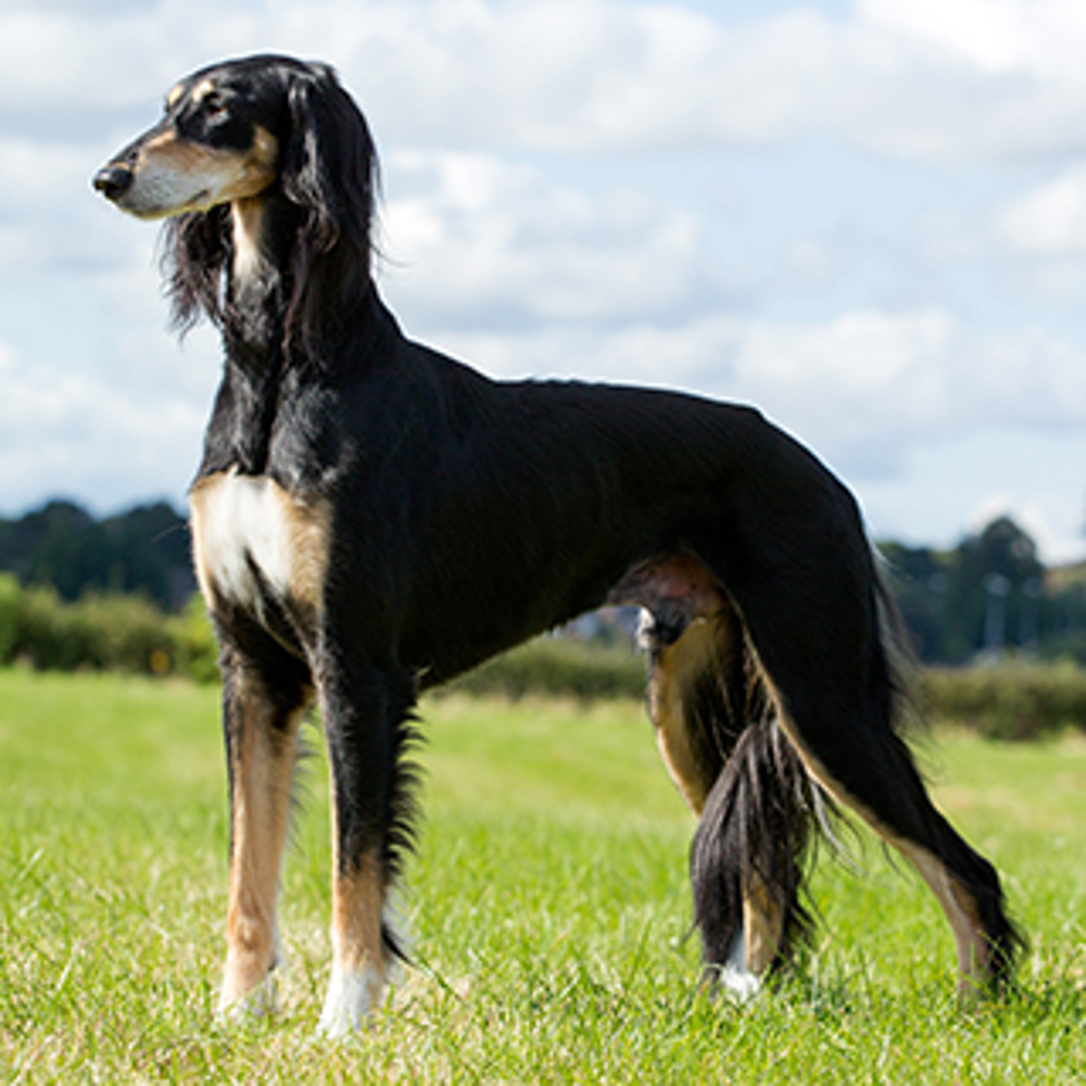 Much prized by the Bedouins along with their Arabian horses, the Saluki is an elegant and light footed hound of the Middle East. The Sheikhs kept careful breeding records and recorded the hunting prowess of their hounds. Their quarry was hare, fox and gazelle and hunting often took place on horseback, the riders using hooded falcons in combination with the hounds. Because of the different terrains in which he could be used for hunting there is a variation of type within the breed, the desert type and the mountain type differing in size and substance. It is thought that the name of the breed was based on the ancient Arabian city of Saluk or the Syrian town of Seleucia. Certainly the breed is imbued with an exotic history and remains much admired for its elegance, gentle temperament and light lifting movement.