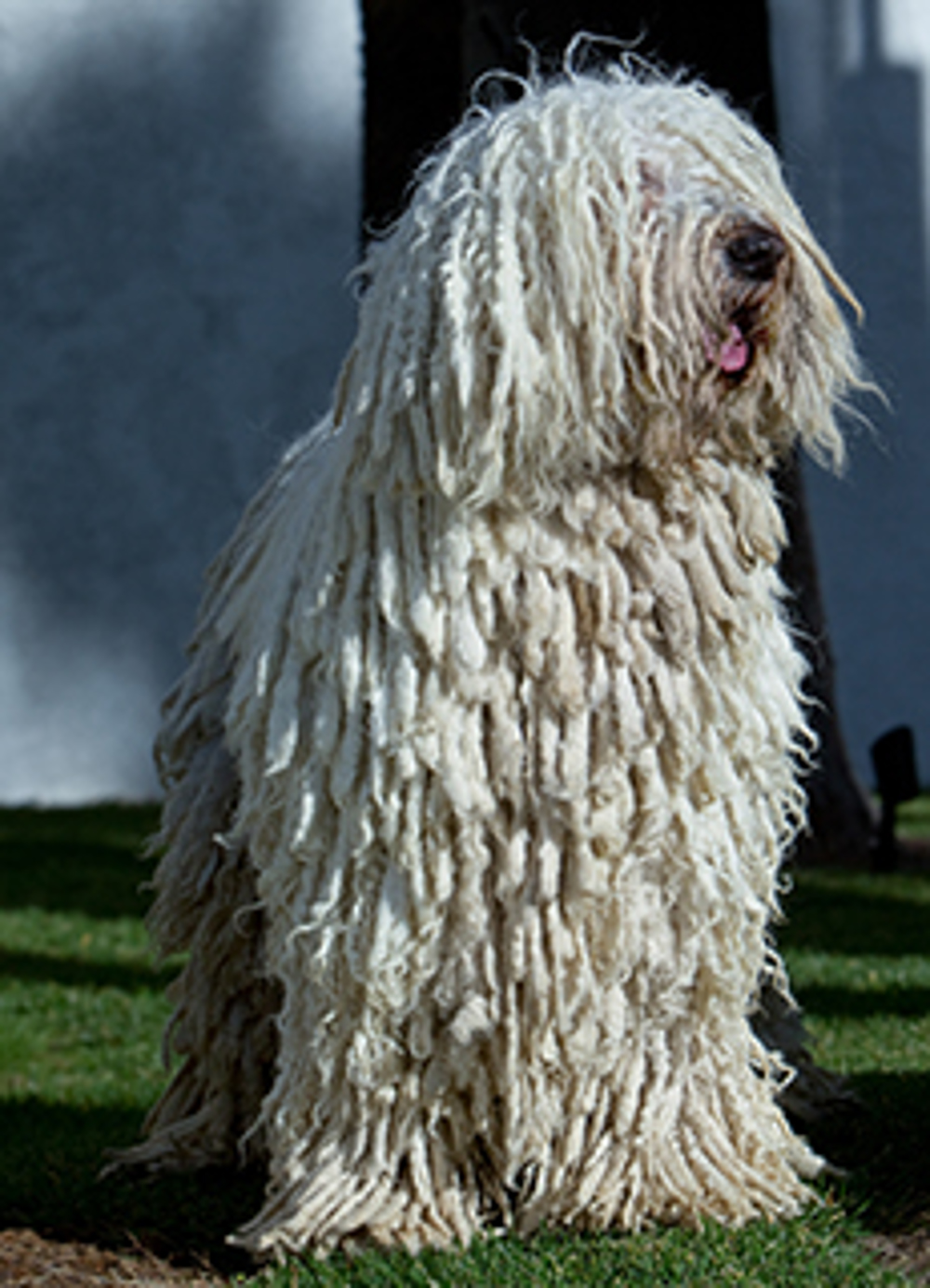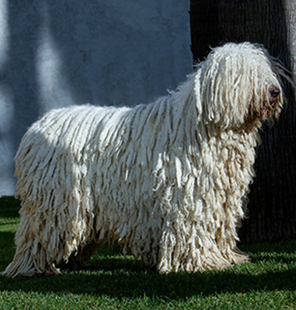 The largest of the Hungarian pastoral breeds the Komondor shares some common ancestry with the Puli and the Kuvasz. He is formidable in appearance: large, powerfully built and, when mature, coated with a dense corded coat. He also has a forbidding temperament, distrustful of strangers and strongly territorial.