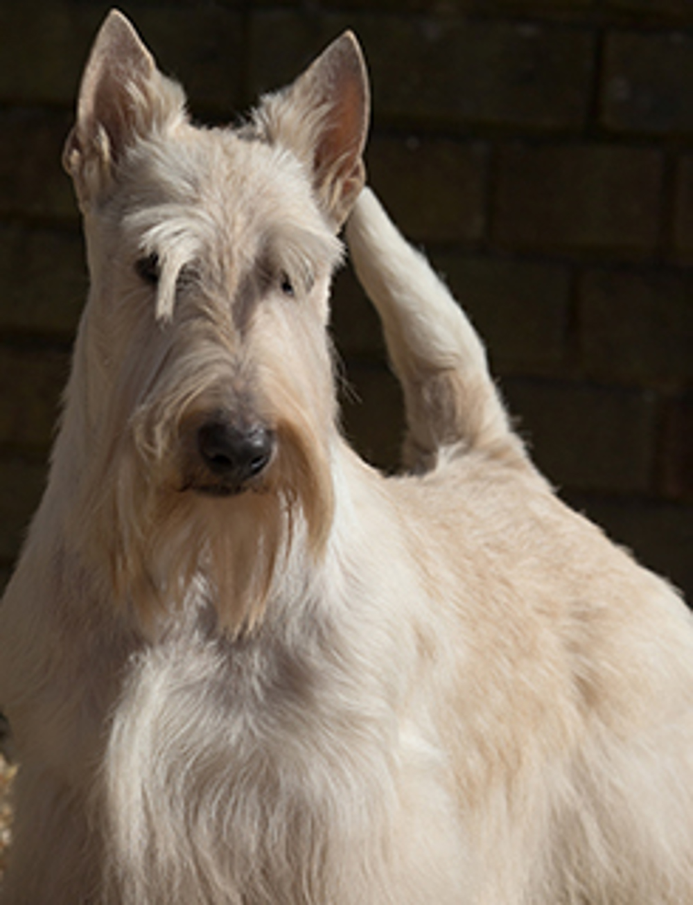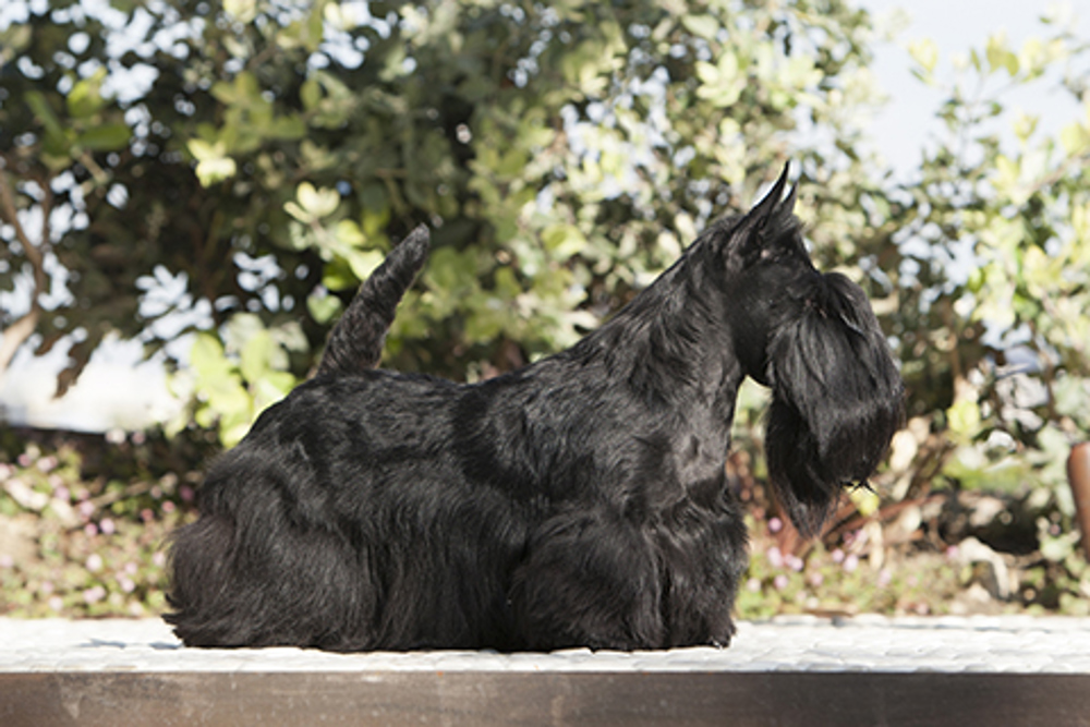 Like the other native Scottish breeds with which it shares its origins, the Scottish Terrier was bred to go to ground after fox and badger and other vermin. In its early days it was known as the Aberdeen terrier because of its proliferation in the area – and as its popularity spread, it acquired the title of Scottish Terrier in 1879, bestowed by Captain Gordon Murray who developed a careful breeding programme to establish type. In 1882 the first breed club was formed and the standard drawn up. The Scottie, as it is affectionately known is remarkably substantial and well boned for its size, its short back, strong neck and long head with small pricked ears give it an unmistakable outline – a “multum in parvo” breed and with great character – independent to the point of stubbornness.