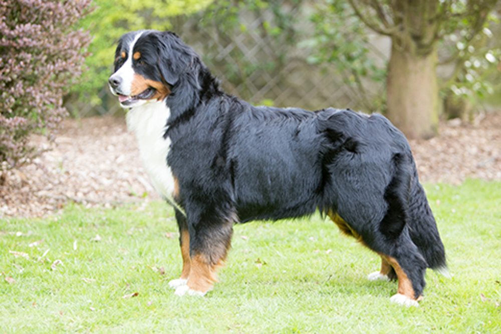 The breed takes its name from the Swiss canton of Berne, where it was developed as a draught dog, pulling carts for the weavers of that area. He was also used as a general farm dog, herding sheep and cattle and also pulling milk and cheese carts. The Bernese is one of the four Swiss mountain dogs which carry the rich black and tan colouring with white markings on the chest which some say represents the cross on the Swiss flag.