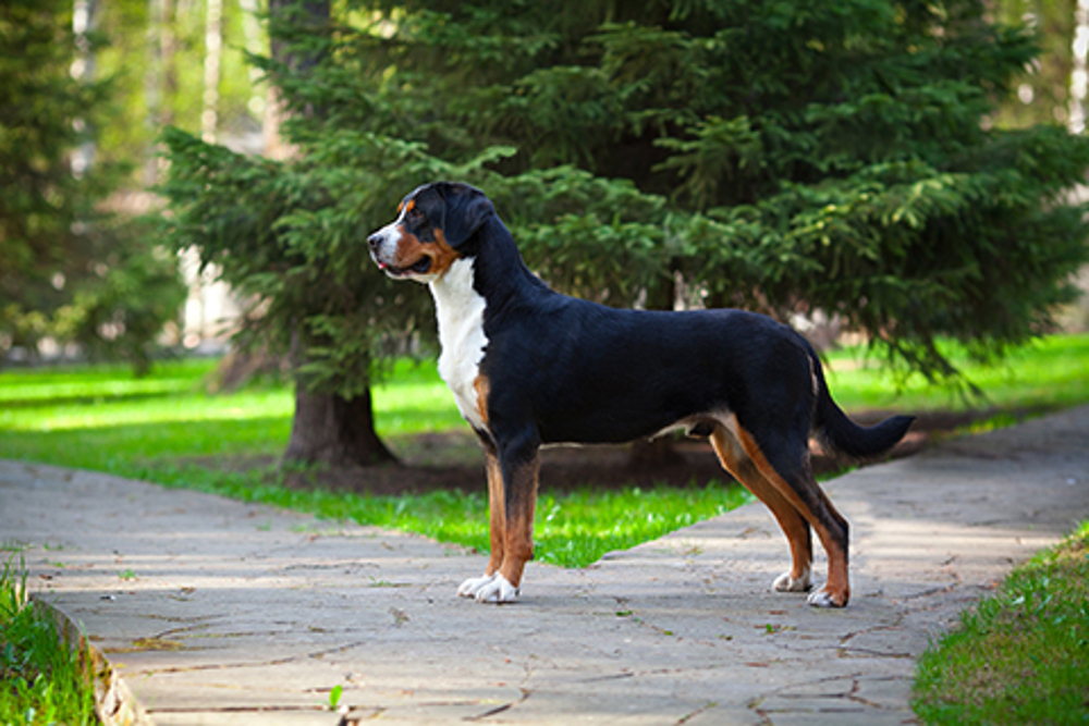 As the name suggests, the Great Swiss Mountain dog is the largest of the Swiss herding breeds and the heaviest in build. He shares the same origins as the Bernese and carries the typical tricolour markings but he has a short dense coat and is perhaps a little heavier in head.
