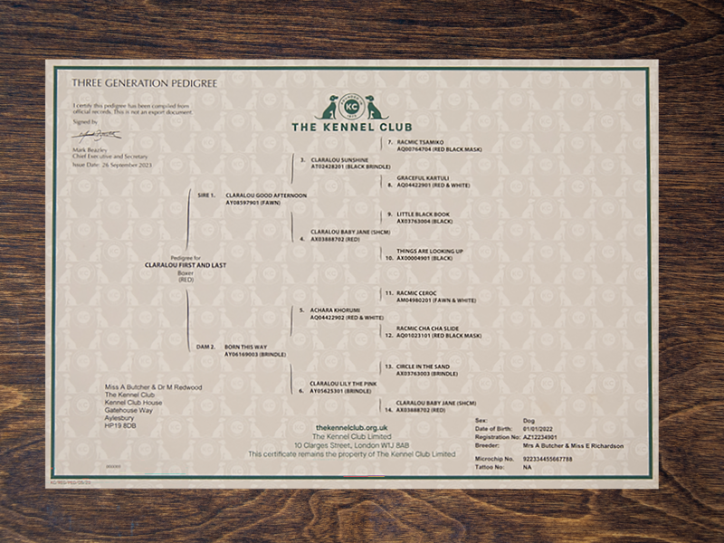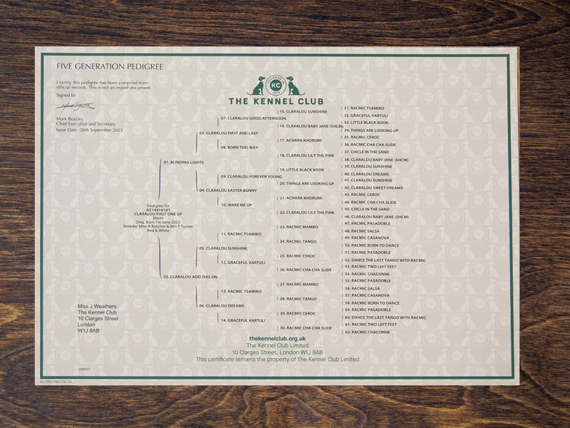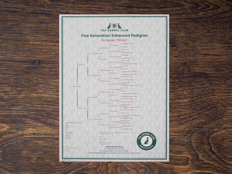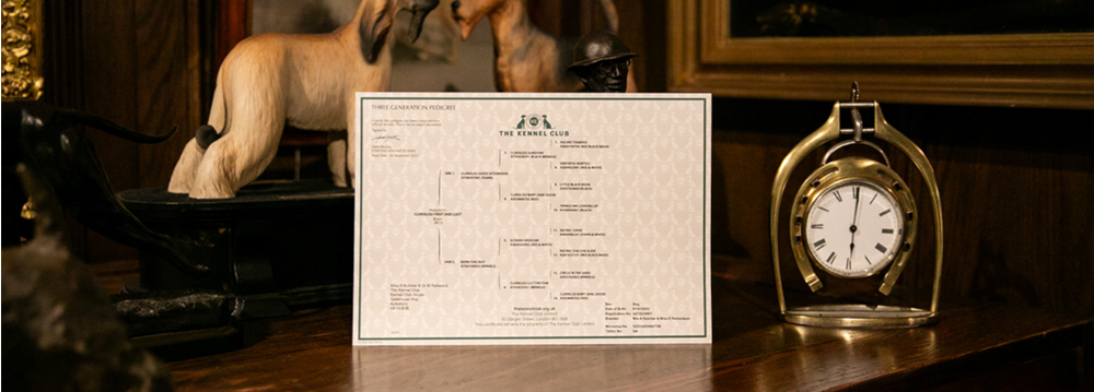 ALL certificates include information of your pedigree dog's ancestry, including breed, colour, sex, date of birth, microchip number, tattoo number, breeder name, and Royal Kennel Club registration numbers.